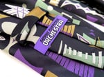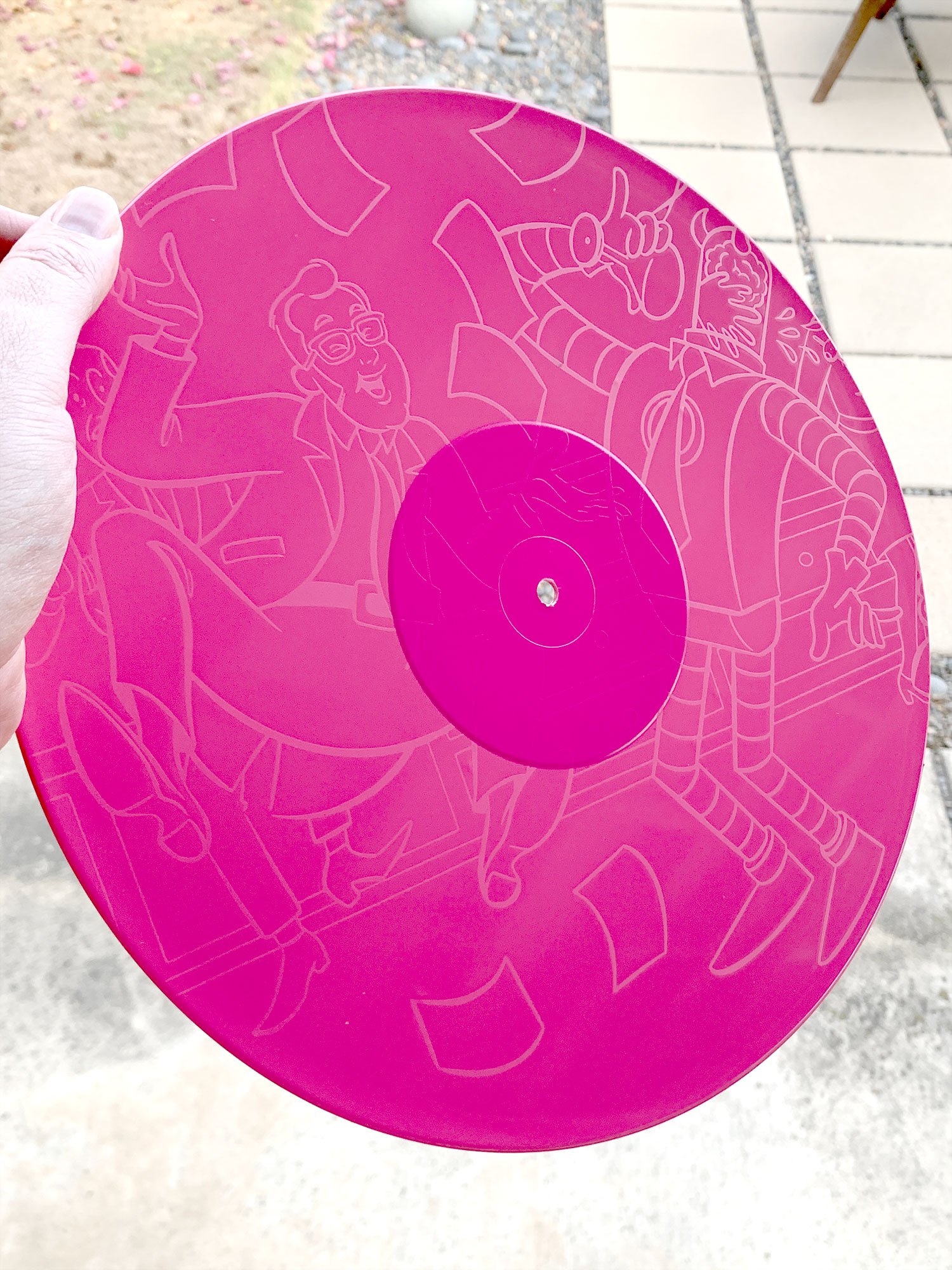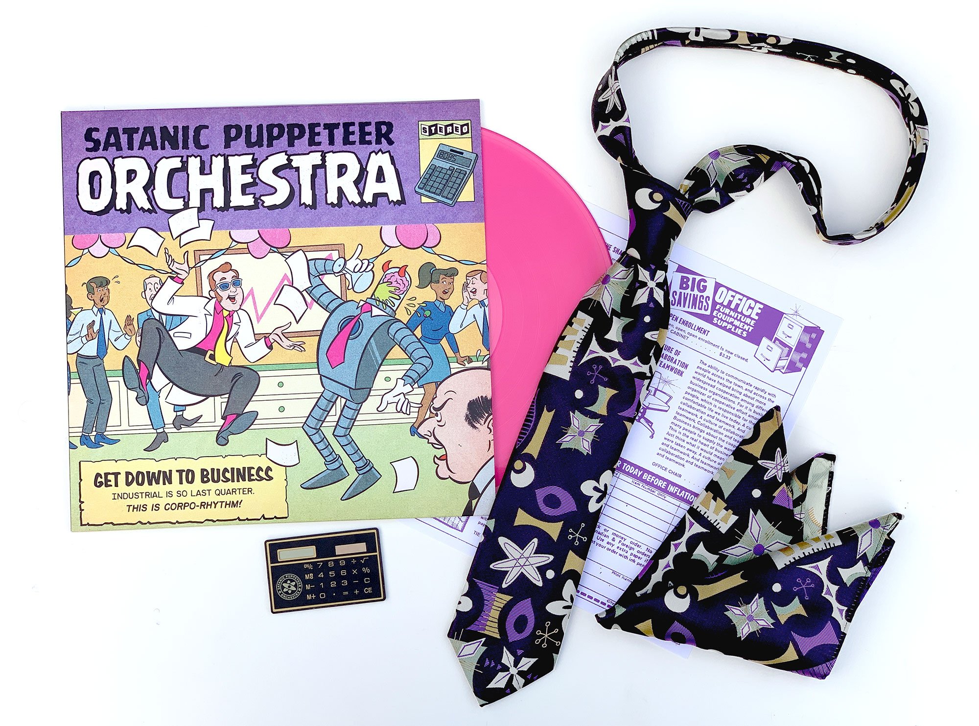 Deluxe limited edition 12" vinyl with custom jacquard woven necktie, matching pocket square, and solar-powered pocket calculator. Opaque pink vinyl with etched b-side, hand-numbered edition of 100.
