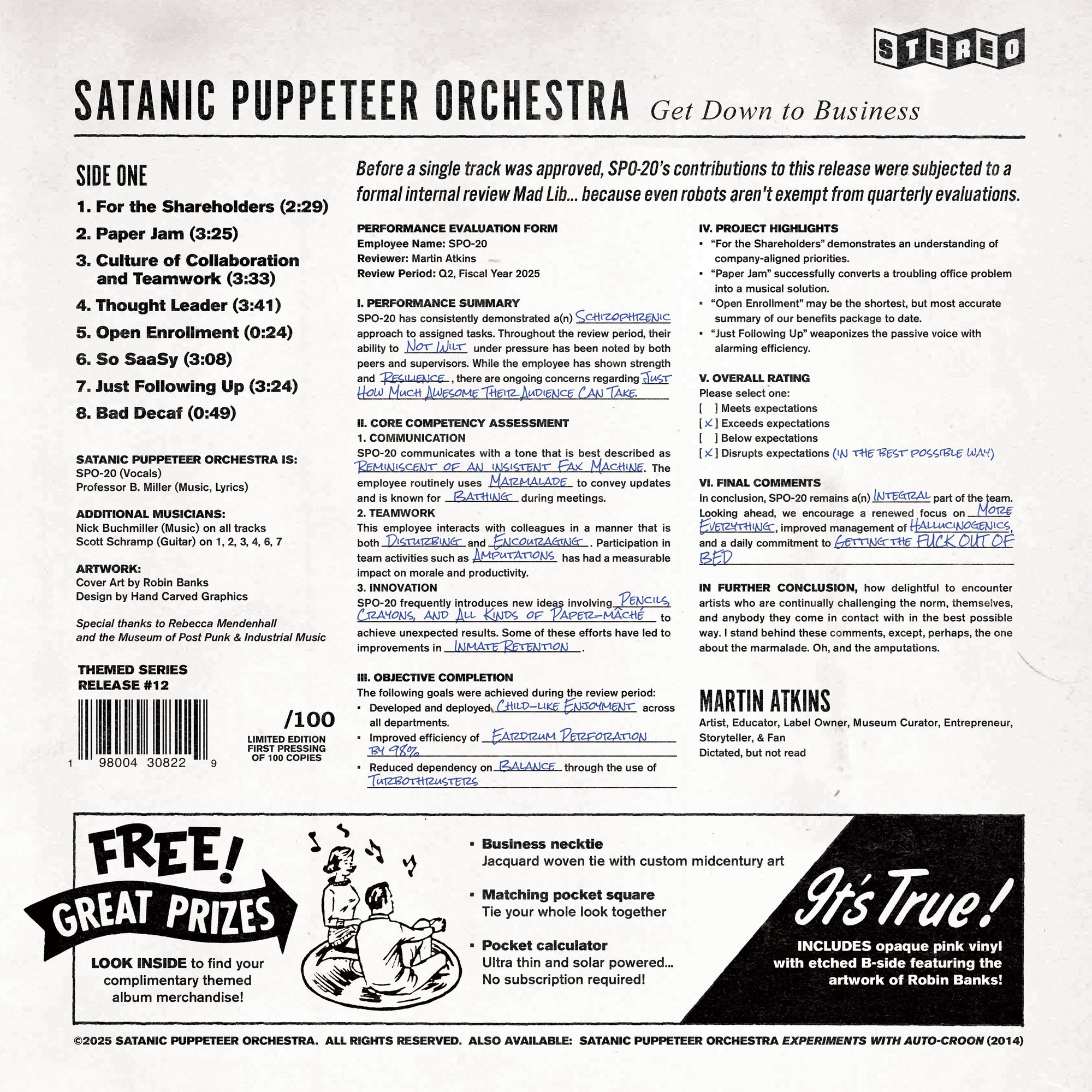 White collar is the new blue collar on this album, which updates the factory machinery samples of industrial music to include sounds found in cubicles. It’s hard to imagine a better vocalist to lament the corporate grind than an actual robot, as embodied by SPO-20 of Satanic Puppeteer Orchestra. Liner notes by Martin Atkins (Pigface, PIL, Nine Inch Nails, Ministry, Killing Joke, Post Punk and Industrial Museum, etc...).